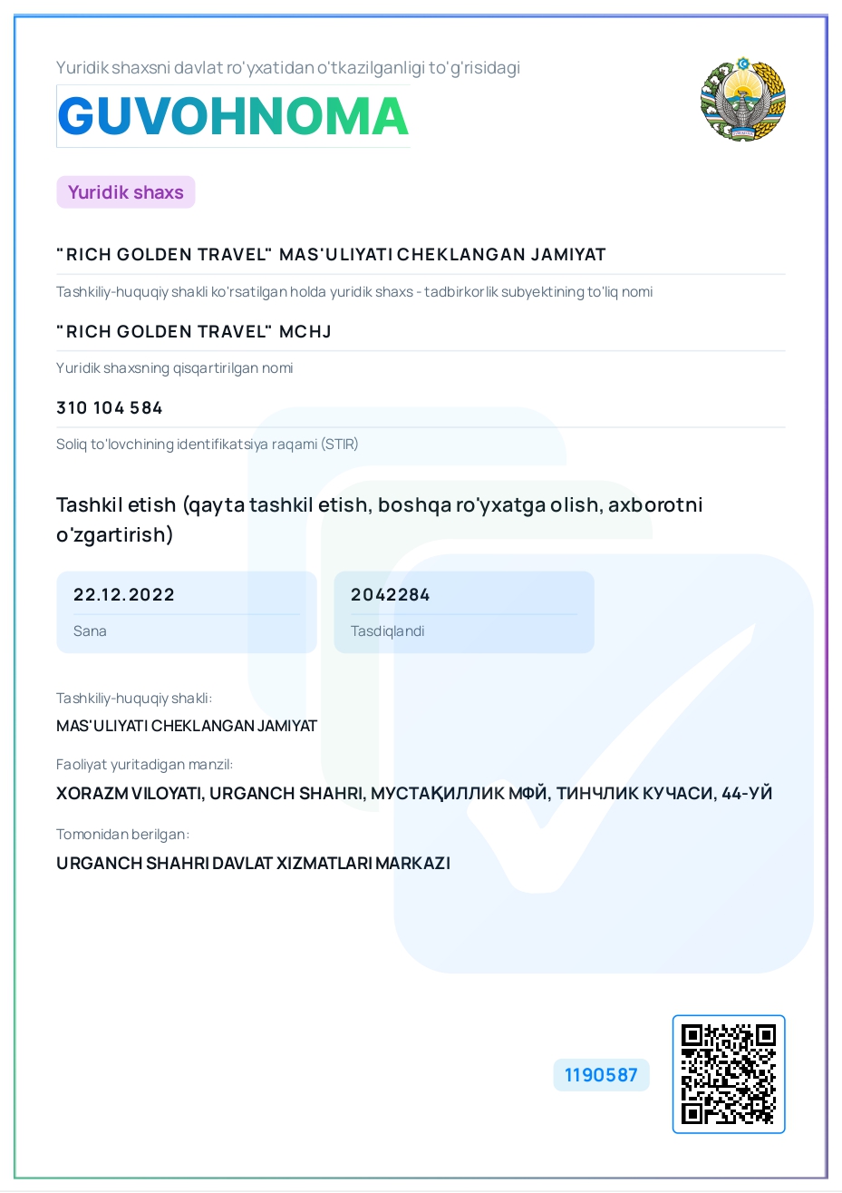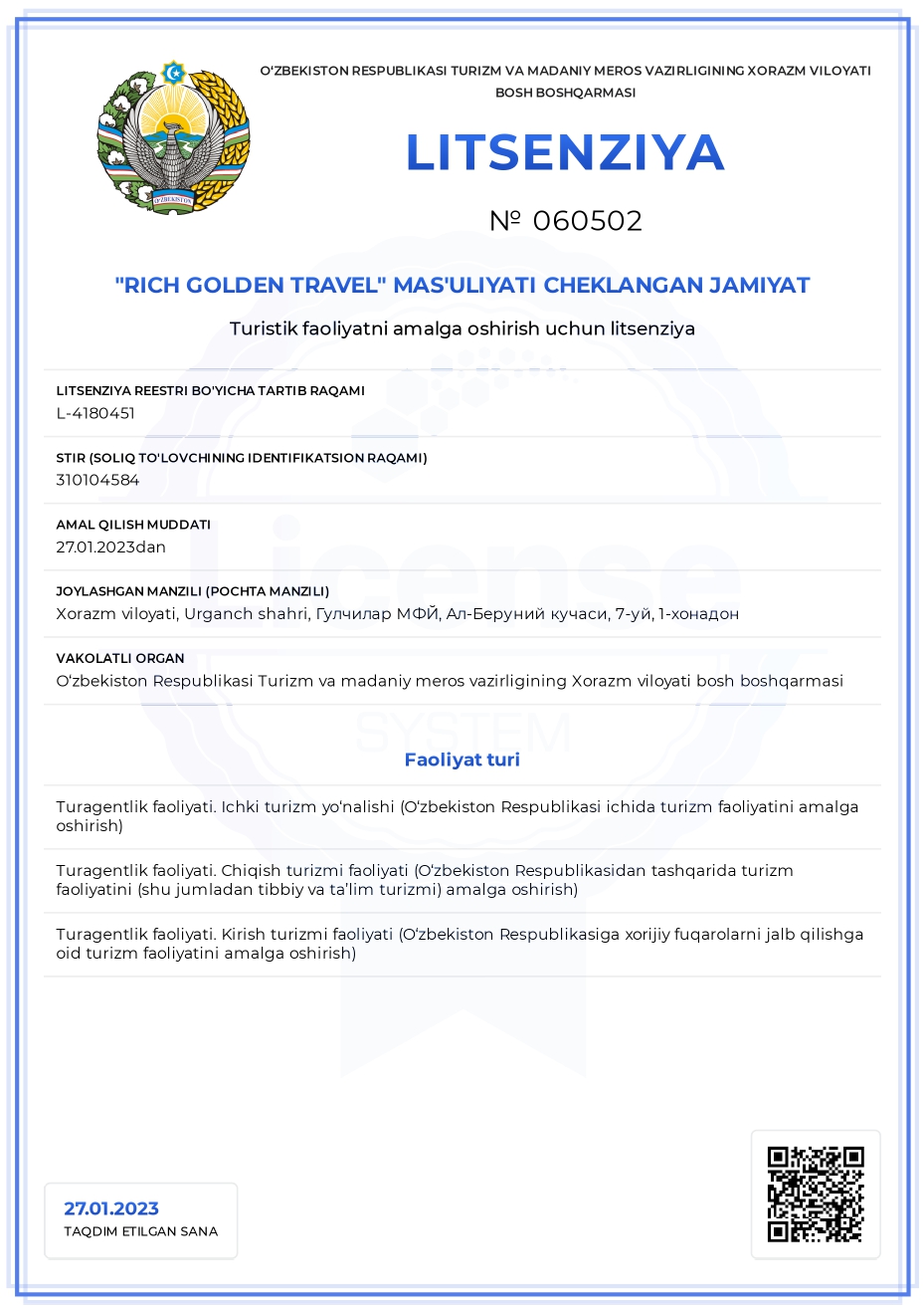 GOLDEN TRAVEL - sayyohlik sohasida yorqin tajribaga ega Turoperator va agentlik faoliyatini muvaffaqiyatli amalga oshiradigan kompaniya hisoblanadi. Kompaniya 21-Dekabr 2022-yilda tashkil qilingan. hozirgi kunda kompaniya professional hodimlar va mustahkam obro’siga ega!